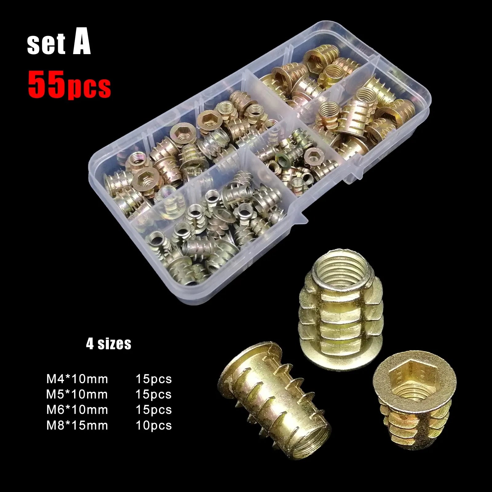 165/75/55pcs Threaded Insert Nut E-nut M4 M5 M6 M8 Set Kit For Wood Furniture Bed Cabinet Table Embedded Hex Hexagon Socket Head