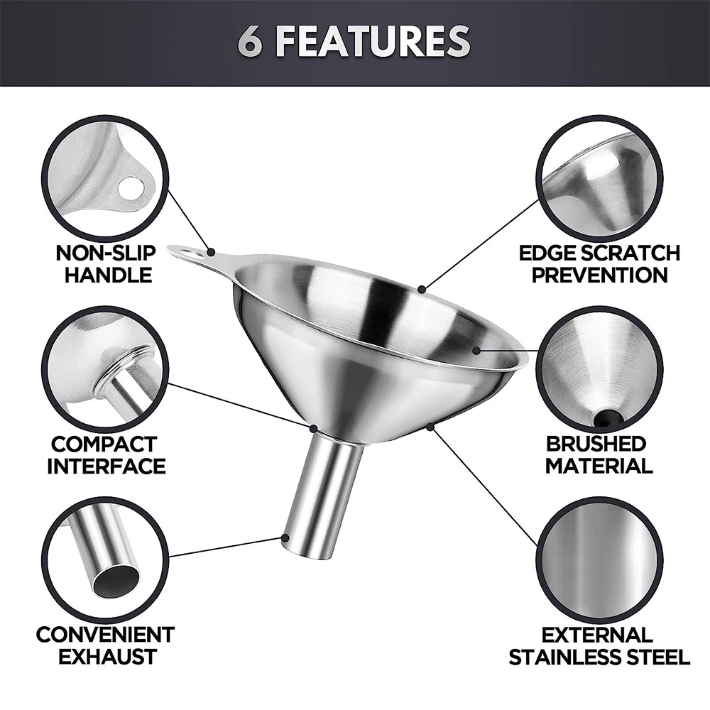 The metal kitchen funnels are well made of 304 stainless steel, safe to use, provides stability and extra security. Durable and long lasting, hard to break