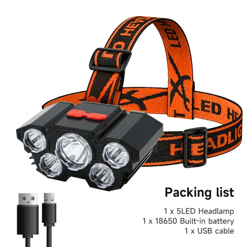5 LED Flashlight Rechargeable with Built in 14500 Battery Strong Light Camping Adventure Fishing Head Light Headlamp