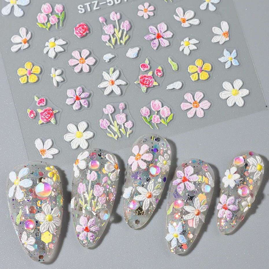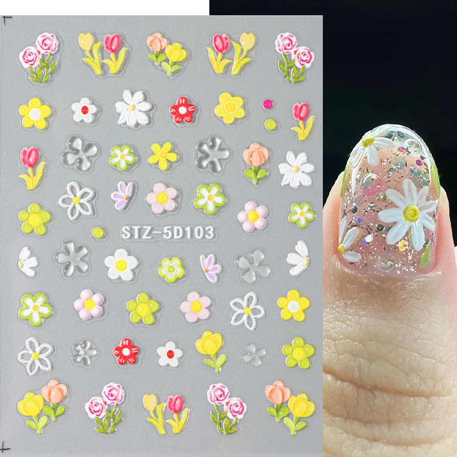 5D Embossed Flower Nail Stickers Decals Sunflower Daisy Spring Engraved Sliders DIY Manicure Decoration Accesories