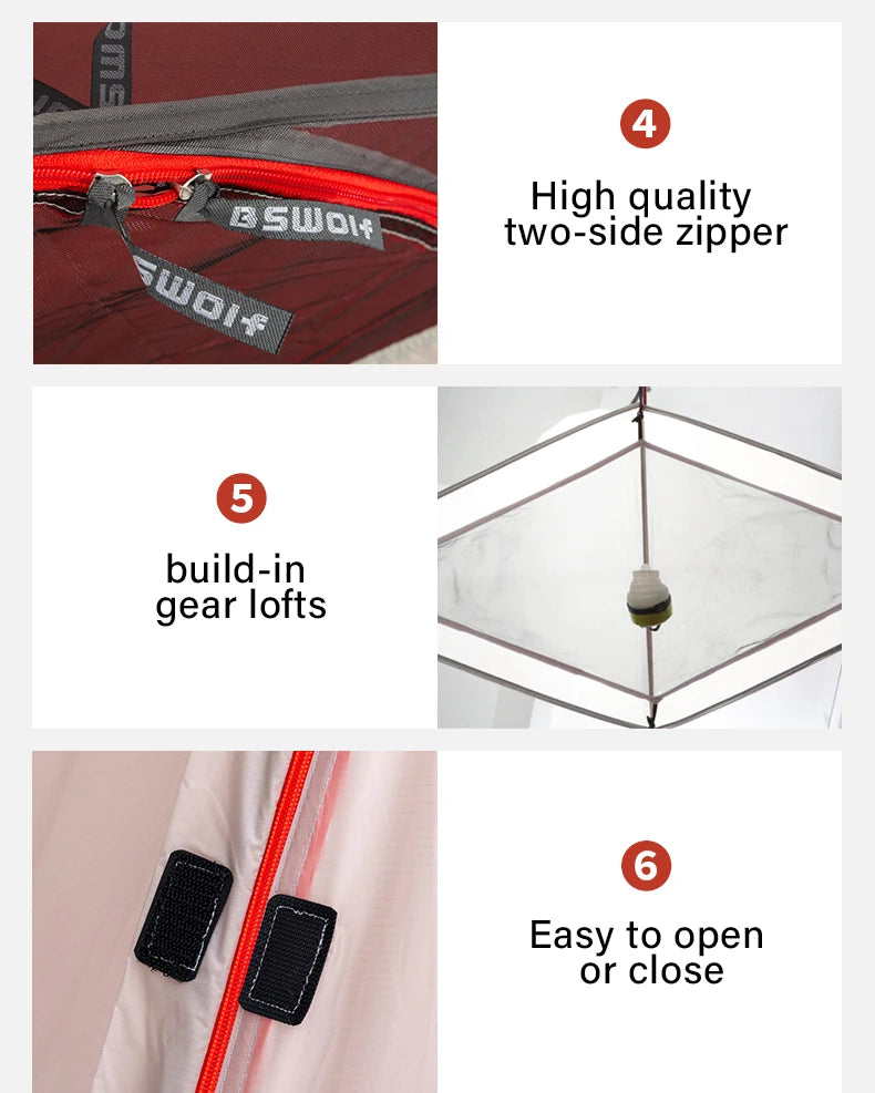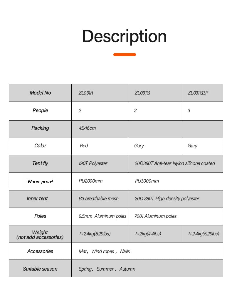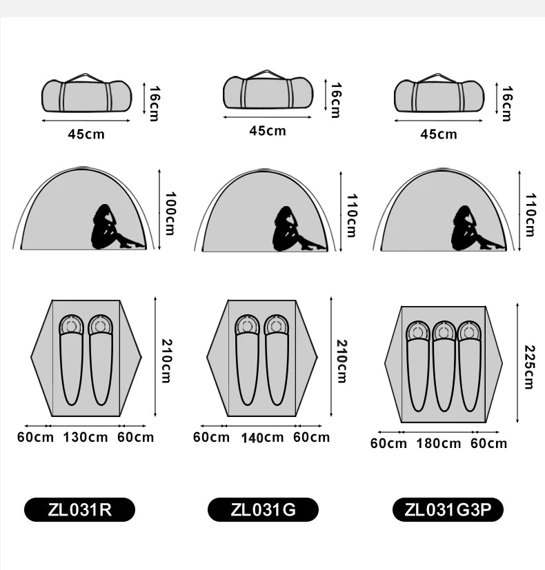 1.LARGE SIZE&LIGHTWEIGHT: Ultralight 2 person tent! ZL031G Interior Size 210*140*110cm. Weight: 2.5kg. including all accessories.Packed Size: 47*16*16CM easy to put in one’s backpack. Larger than most 2 person backpacking tents and even could fit a little dog more.