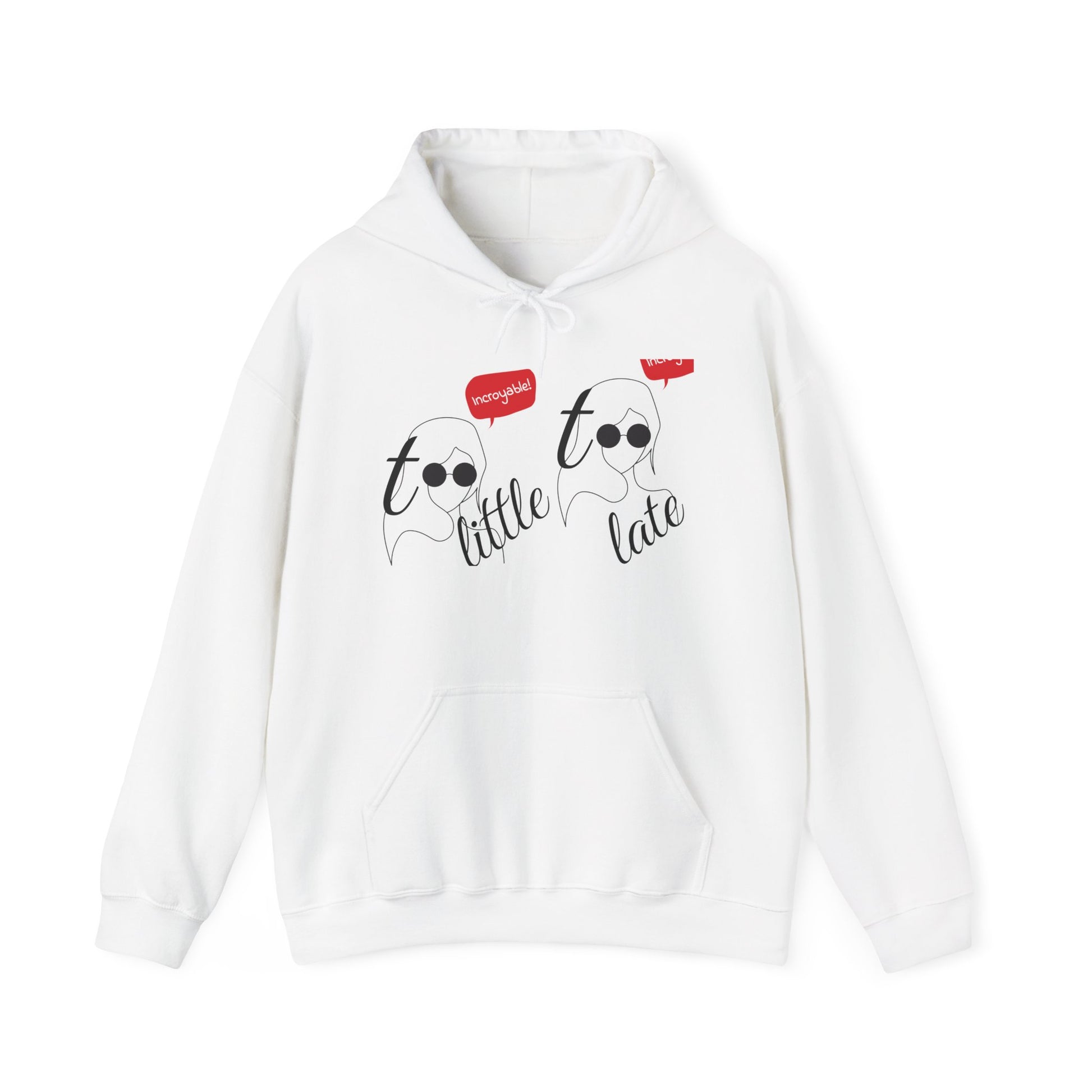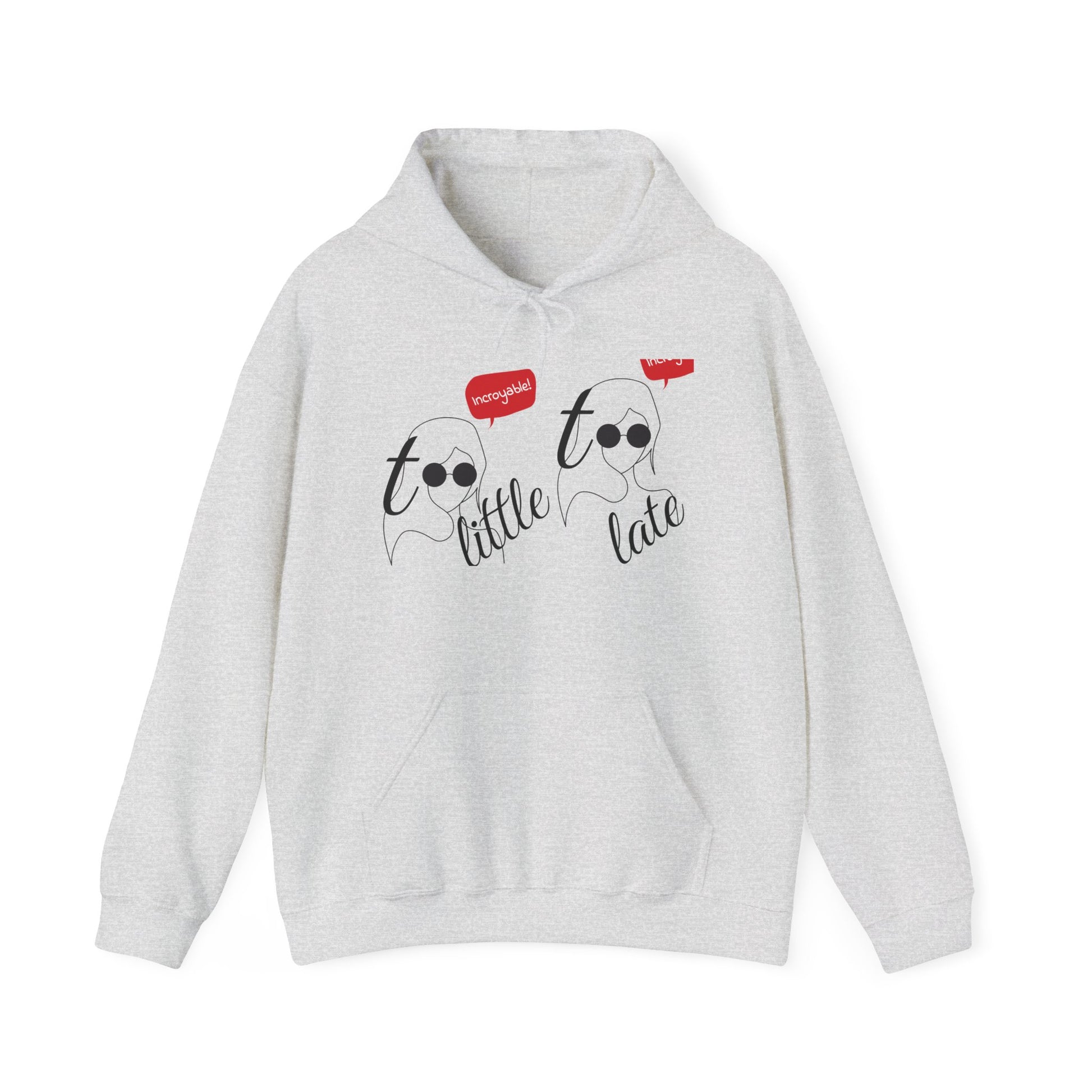 Fun Playful Artistic Remark Unisex Hooded Sweatshirt, Too Little Too Late Design, Comfort Style Trendy Casual Cozy Nights, Kangaroo Pouch
