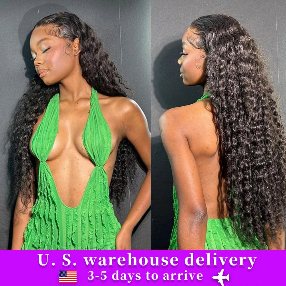 Long Deep Wave Lace Front Wigsfor Women 210% Density Curly Lace Frontal Wigs Human Hair Pre Plucked Natural Black (38 Inch)