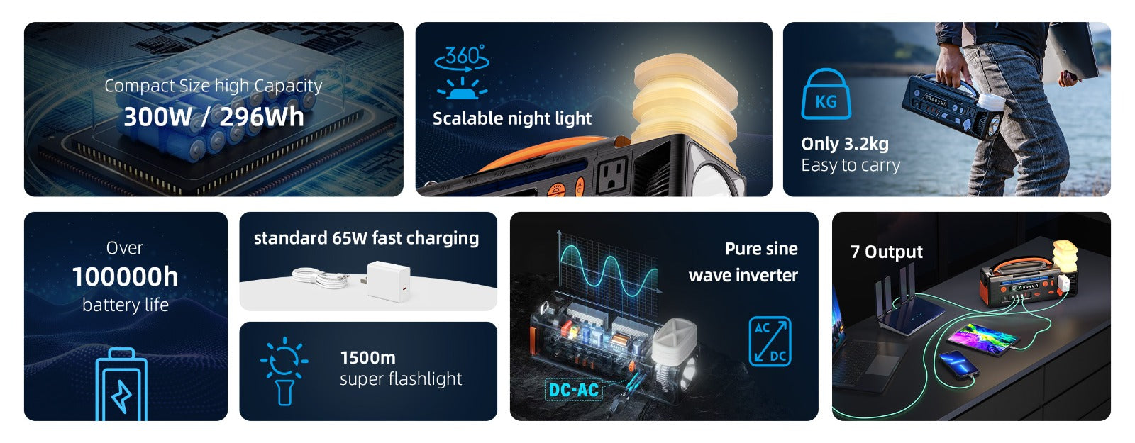 Charge Up to 7 Devices Simultaneously: Equipped with 1* 300W AC outlet, 1* 100W USB-C PD port (in/output), 3* QC 3.0 USB-A ports (22.5W each), 1* car port, and 1* DC port. this power station can power multiple small devices such as mini-fridges, laptops, drones, cameras, projectors, lights, TVs, and smartphones. perfect for outdoor and home use.