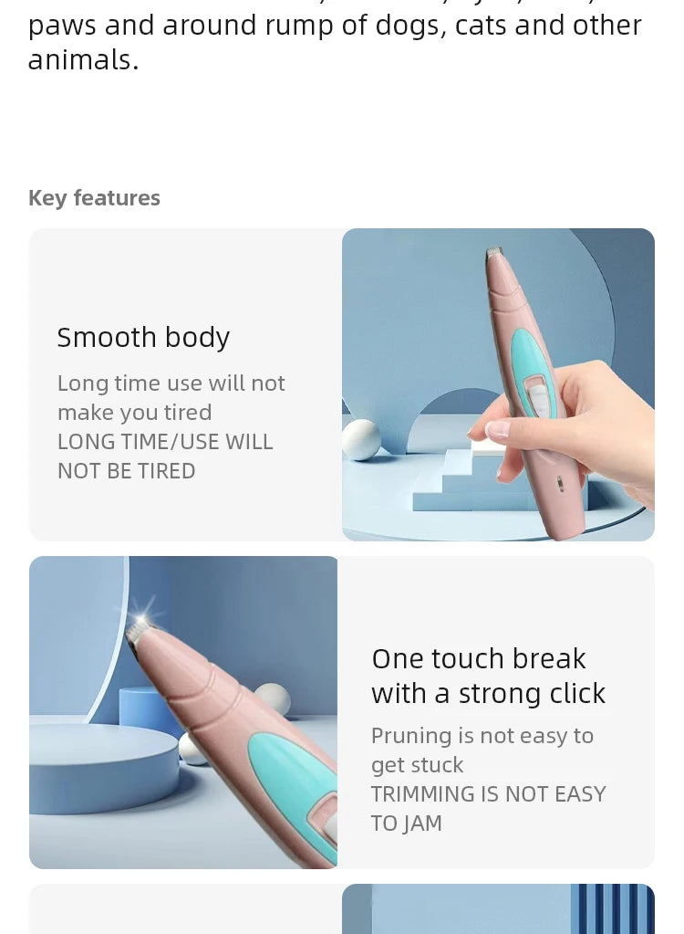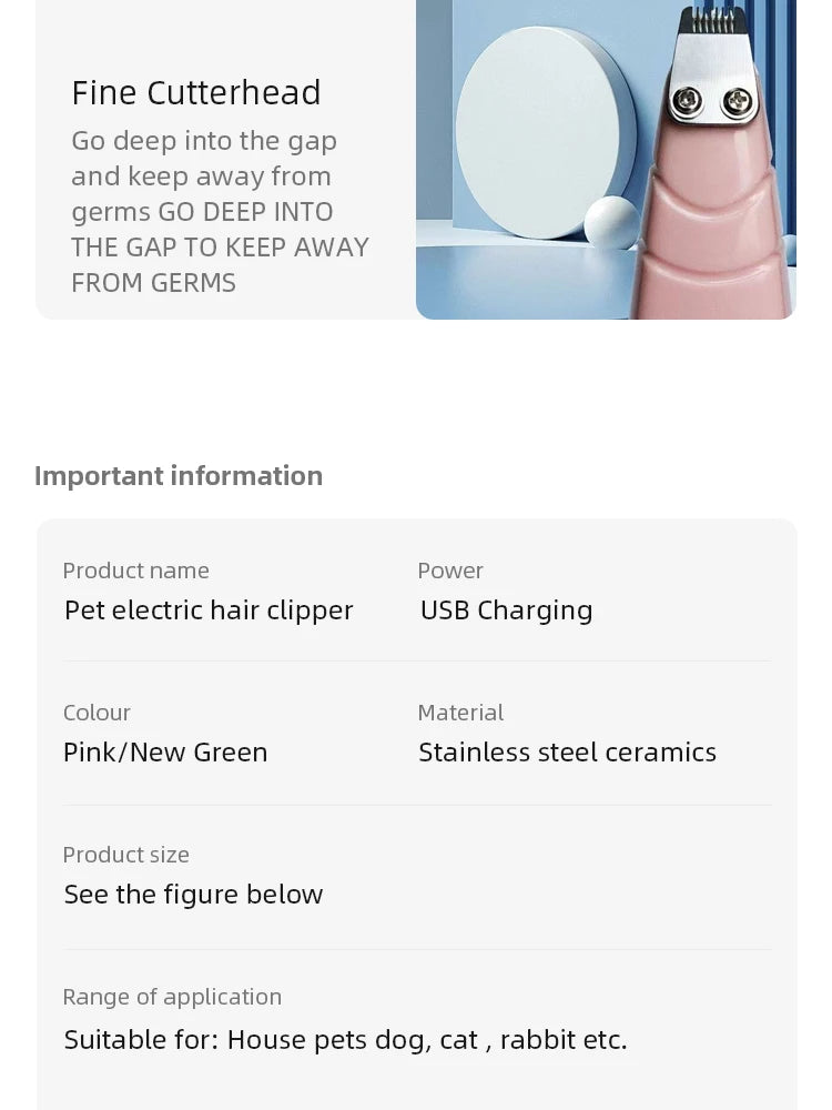 • Professional Pet Hair Trimmer: This electric hair trimmer is a professional tool, designed specifically for pet grooming. It's perfect for maintaining your pet's hair at home.