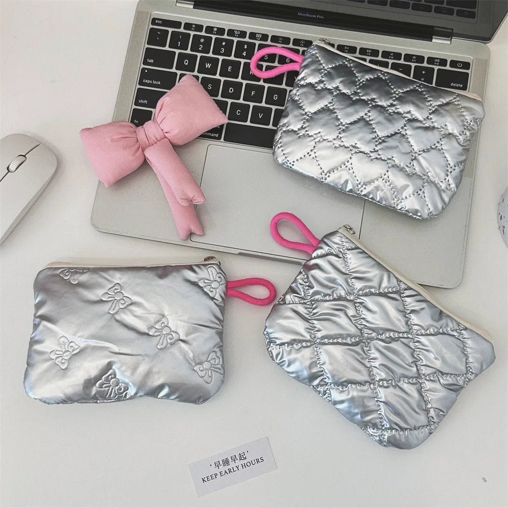 Silver Lingge Bow Pattern Coin Purses Small Canvas Coin Wallet Lady Girls Earphone Coin Key Money Storage Bag Zipper Pouch