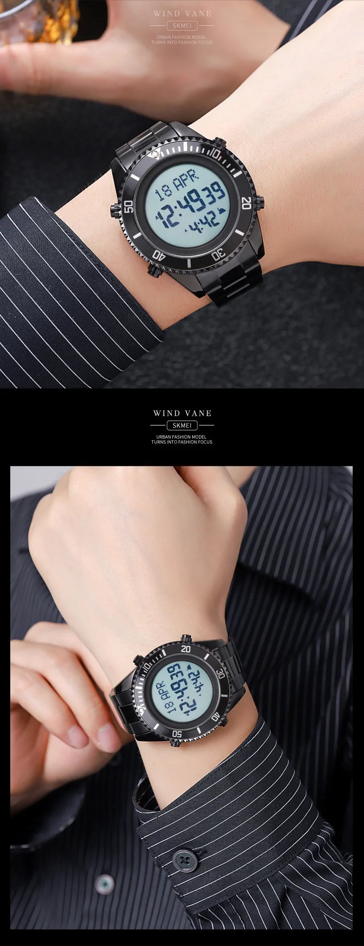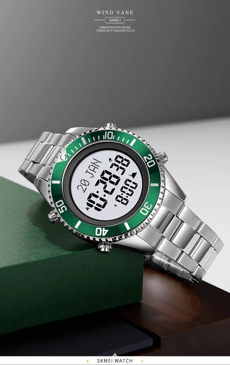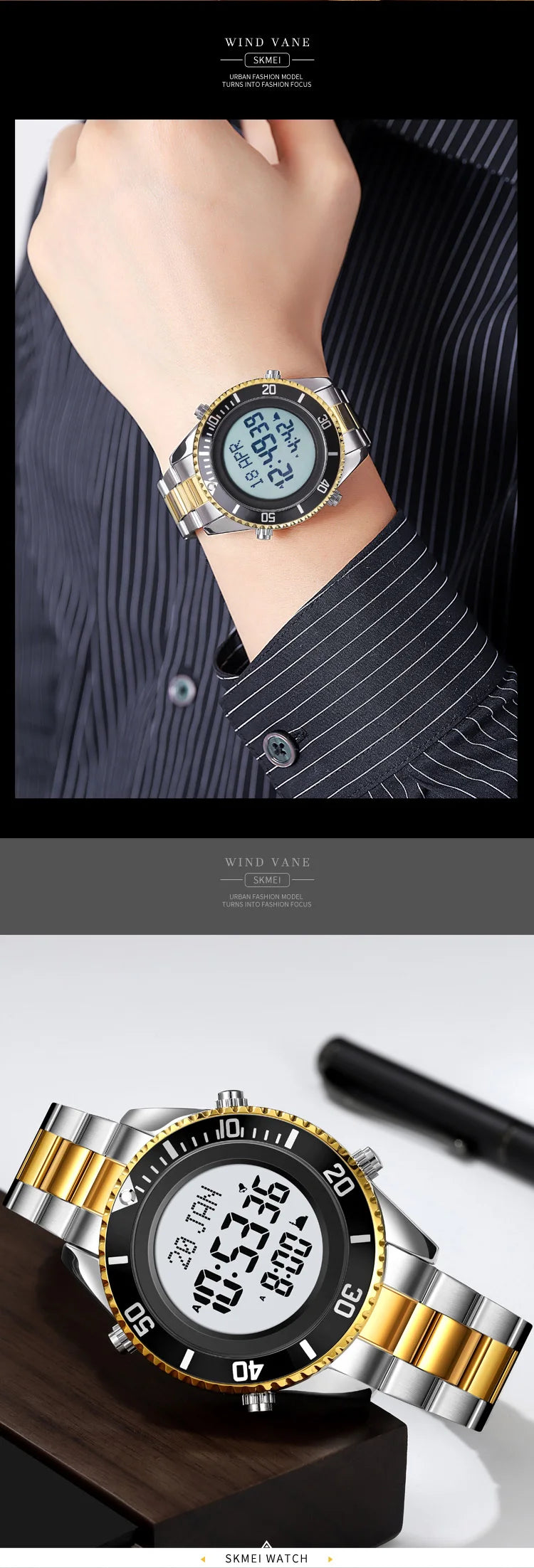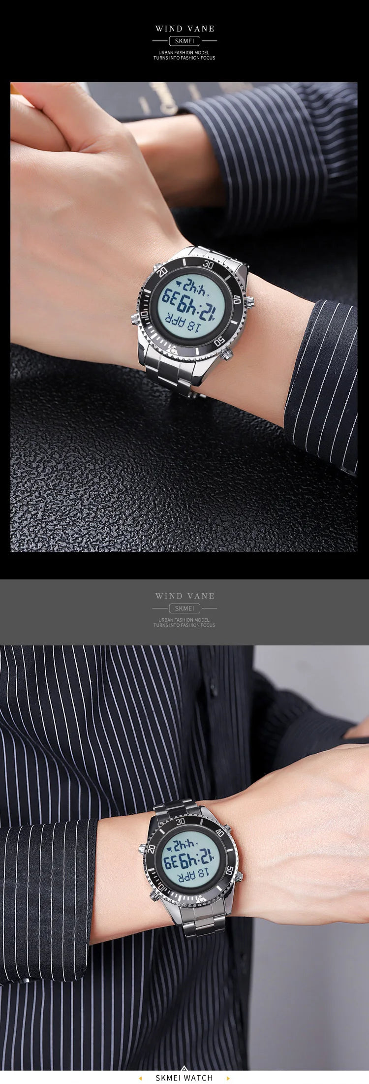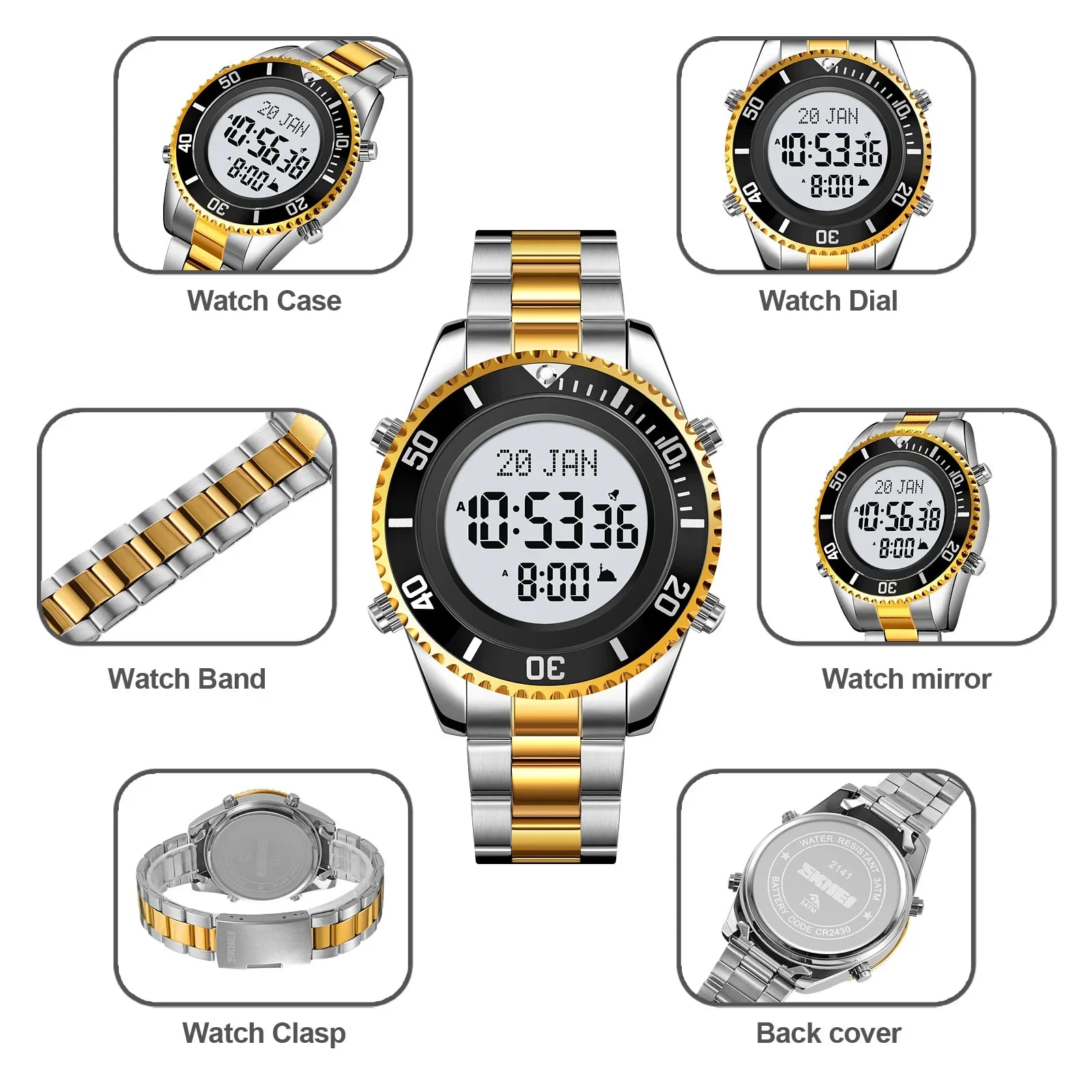 SKMEI 2141 Stainless Steel Digital Watche Muslim Azan Prayer Compass Clock Adhan Alarm Hijri Islamic Wristwatch with Back Light