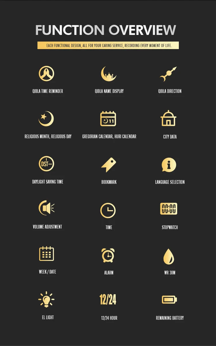 8.Function: dateBack light,week,chrono,alarm,week,12/24 hour clock,pilgrimage time reminder,qibla name display,qibla direction,eligious month,religious day,gregorian calendar,hijri calendar,city data,summer time,bookmark,language selection,volume adjustment,remaining battery time