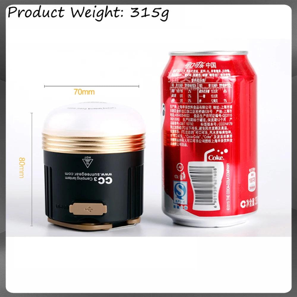 This camping lantern is equipped with United States imported LED, offering up 550 lumens of illumination at the highest mode. It can be positioned horizontally or vertically, also sticking to a metal part is possible because of its magnetic base. The water tightness level is IPX5. CC is a rechargeable camping lantern and a perfect companion for traveling. With universal standard USB interface, it can be used as a moving power supply for our electronic devices as PDAs, mobile phones or for iPods, make your travel more convenience.