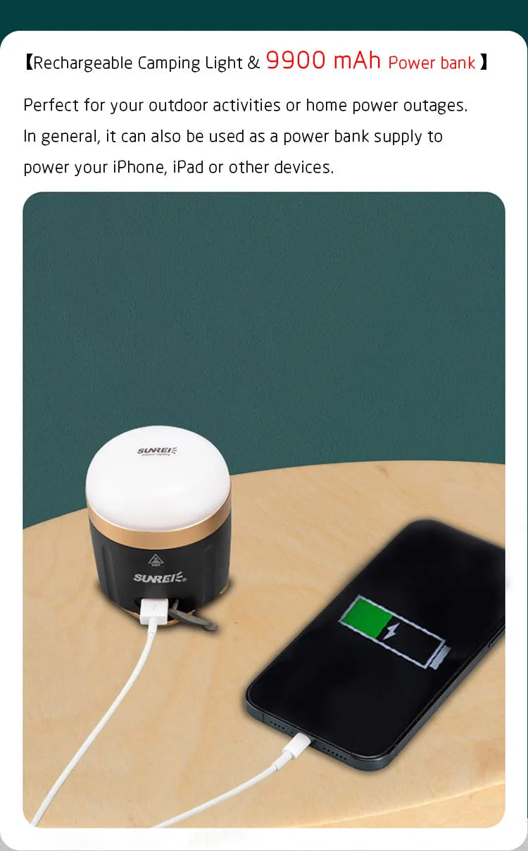 【9900mAh Power Bank】USB Rechargeable camping lanterns built-in 9900mAh lithium-ion battery operated (high quality USB cable included), with a 5V 2A fast charging USB port, charge your phones, iPad conveniently when needed. Support 5V DC charger adapter (not included).