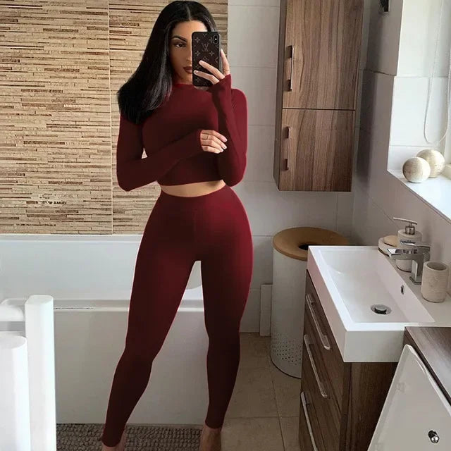 Two Piece Sets Women Solid Autumn Tracksuits High Waist Stretchy Sportswear Hot Crop Tops And Leggings Matching Outfits