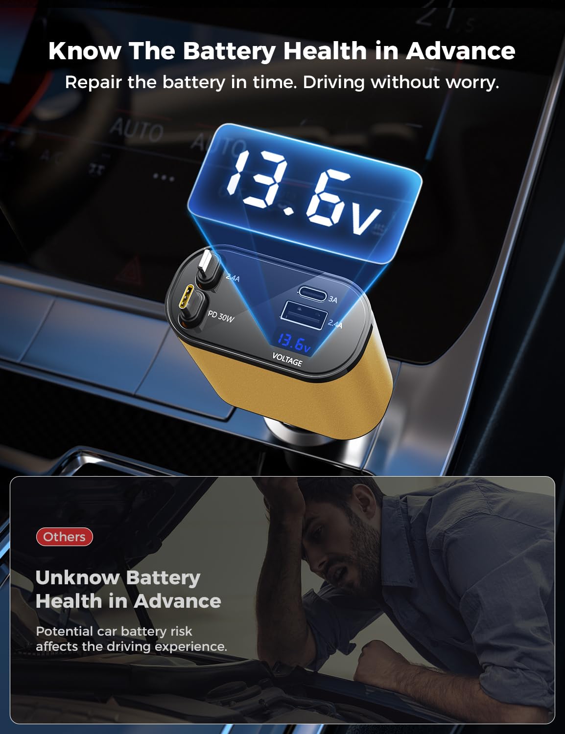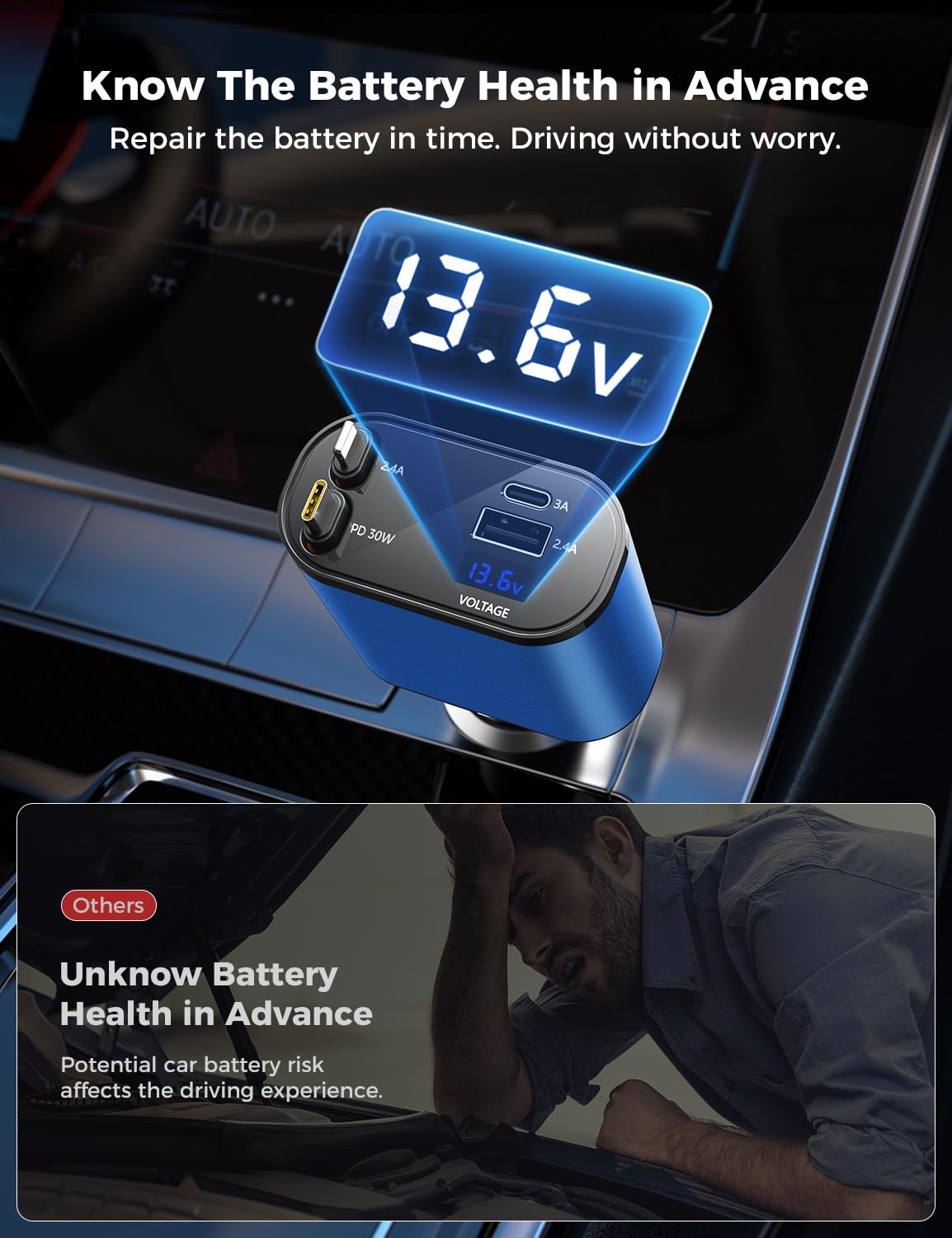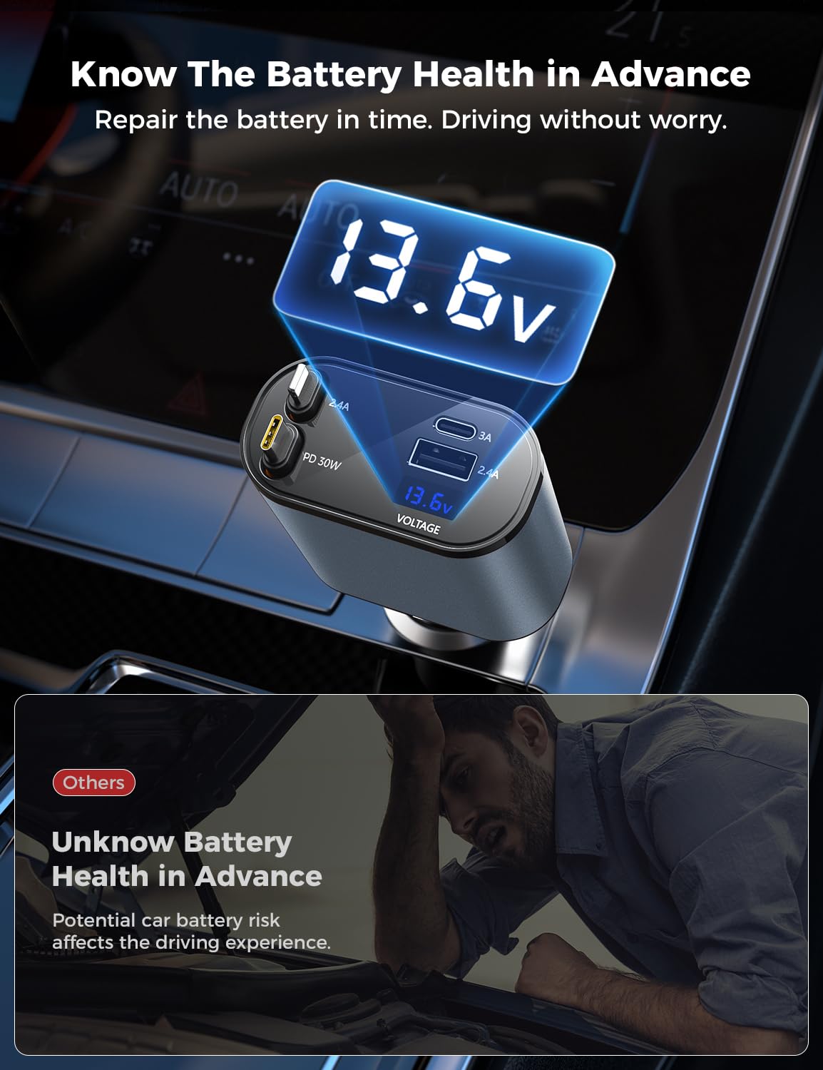- Voltage Display for Battery Health Monitoring: Our Car Charger with cord is equipped with a voltage display feature, allowing you to monitor the health of your car battery at all times. Stay informed and ensure optimal performance for your vehicle. Best car/truck accessories for men.